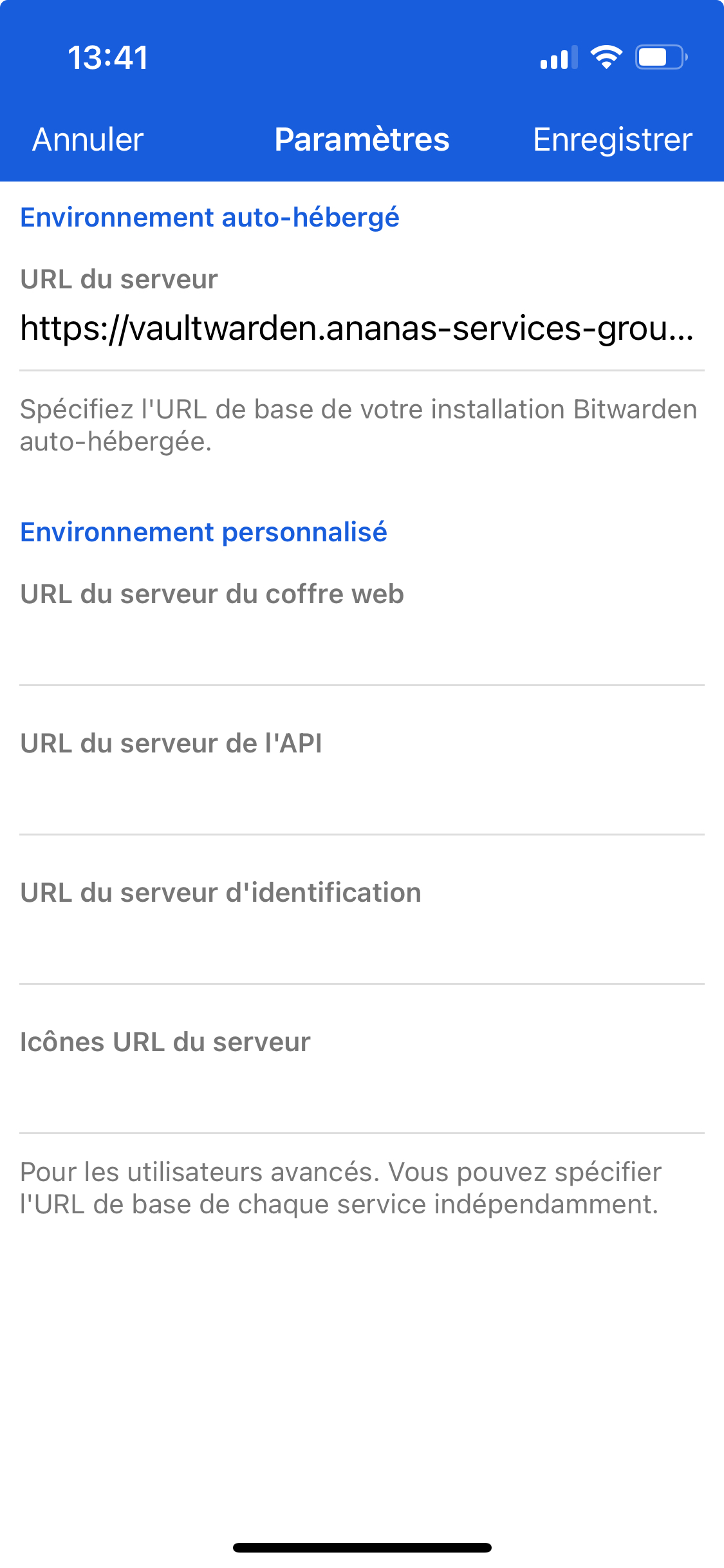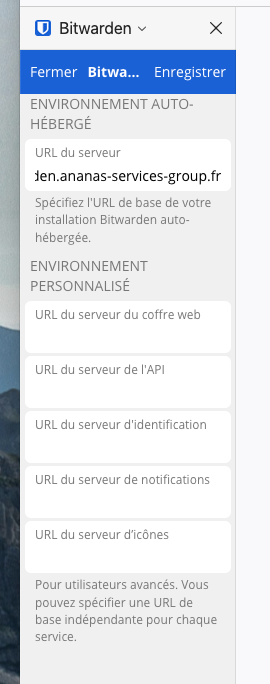 - Dans le champ "URL du serveur" entrer l'adresse suivante : https://vaultwarden.ananas-services-group.fr