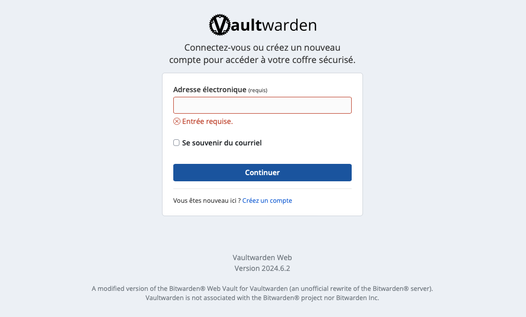 Avant toute chose il vous faudra un compte utilisateur. Dans notre cas la création en autonome est désactivée, contactez votre administrateur pour obtenir un compte. Vous aurez besoin d'une adresse mail et de définir un mot de passe maître à forte sécurité dont il faudra vous souvenir. Ce sera le seul que vous aurez à mémoriser pour accéder à tous les autres. Choisissez bien sans sacrifier la sécurité de votre compte !