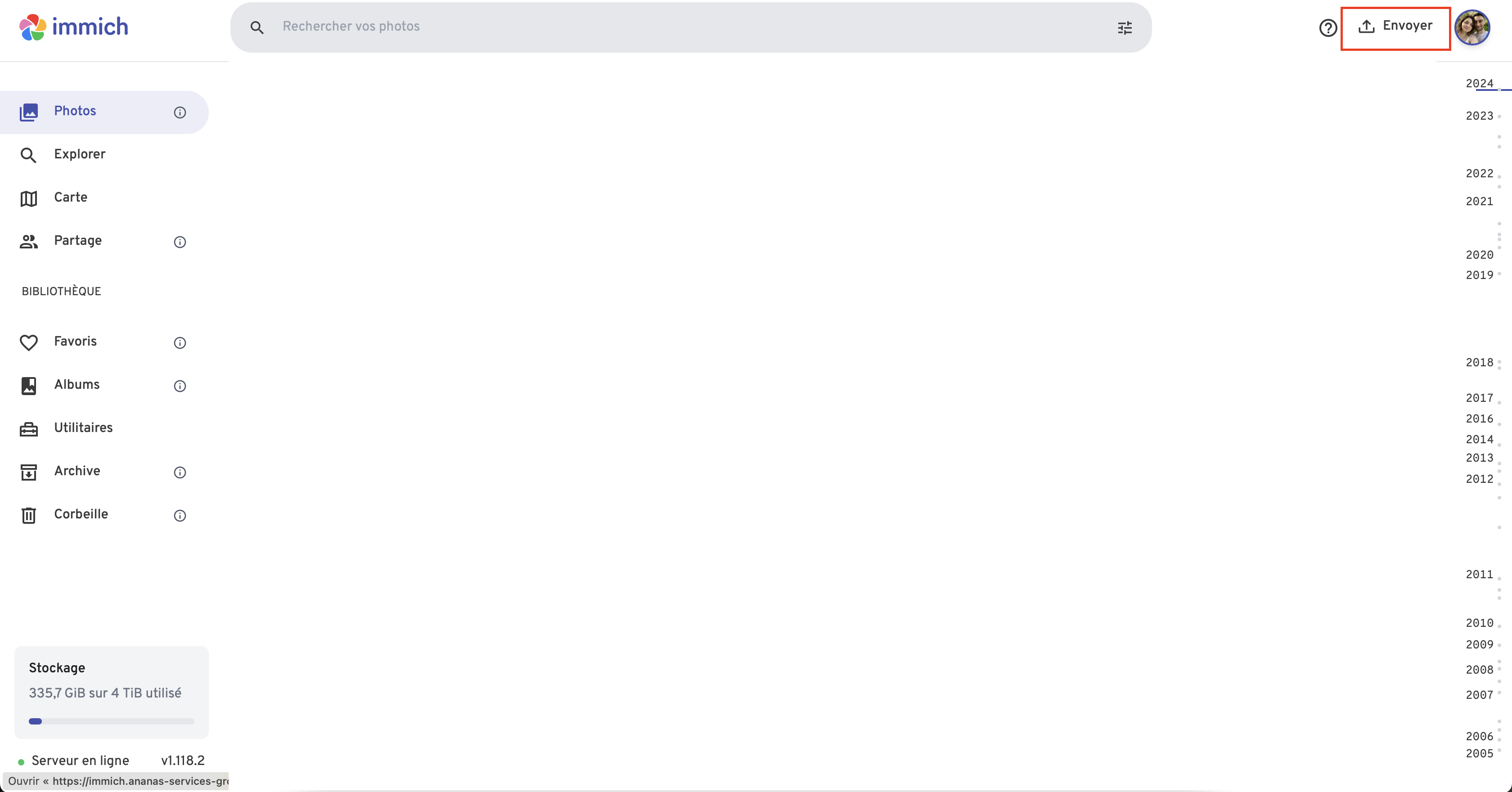 Pour sauvegarder vos photos depuis l'interface web un glisser-déposer permet d'envoyer vos photos et vidéos vers le serveur. Vous pouvez également appuyer sur le bouton "Envoyer" en haut à droite de l'interface.