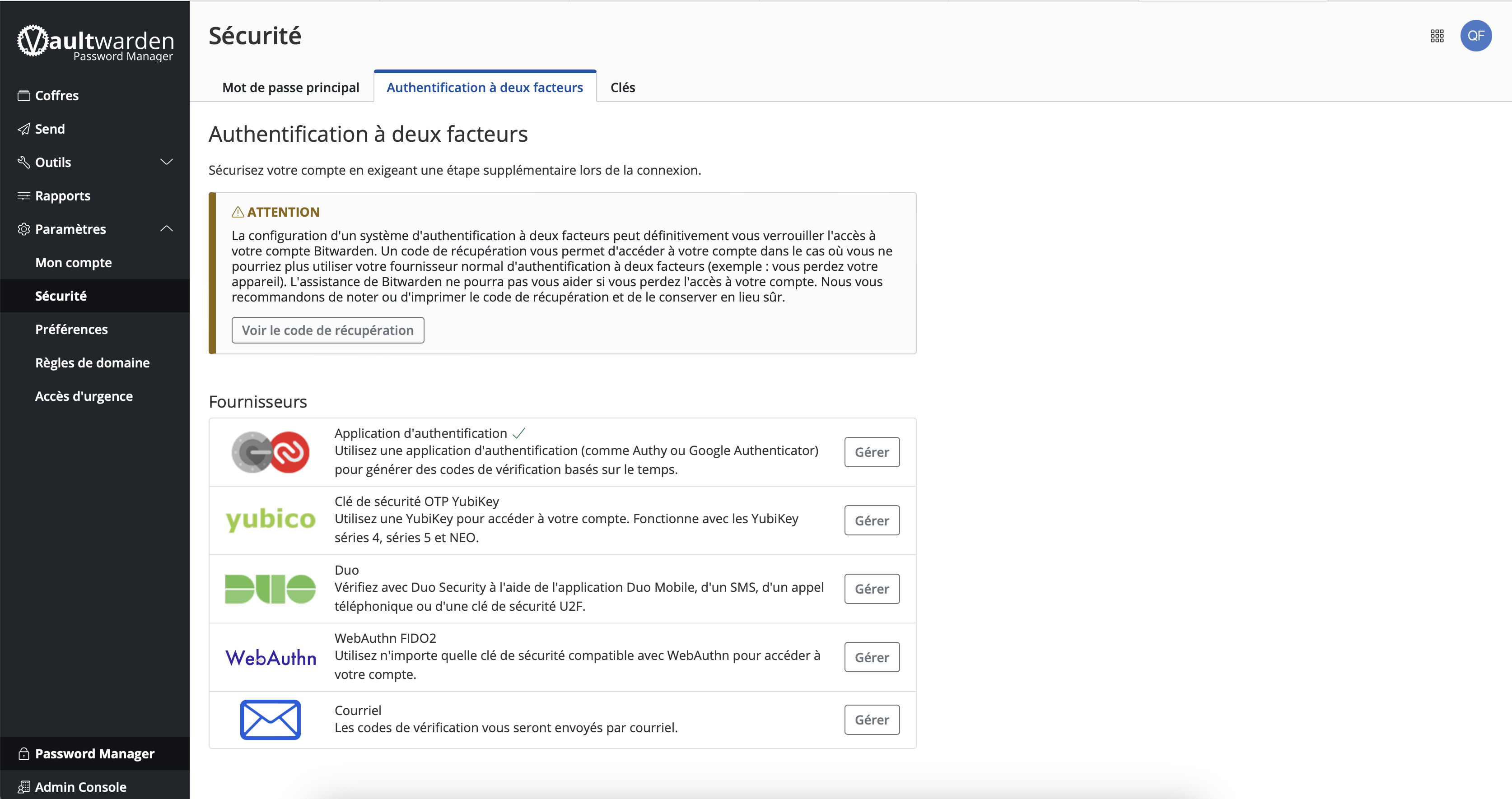Il existe de nombreuses méthodes différentes pour l'identifiant en deux étapes, allant des applications d'authentification dédiées aux clés de sécurité matérielles. Quel que soit votre choix, Bitwarden recommande vivement de sécuriser votre coffre en utilisant l'identifiant en deux étapes.